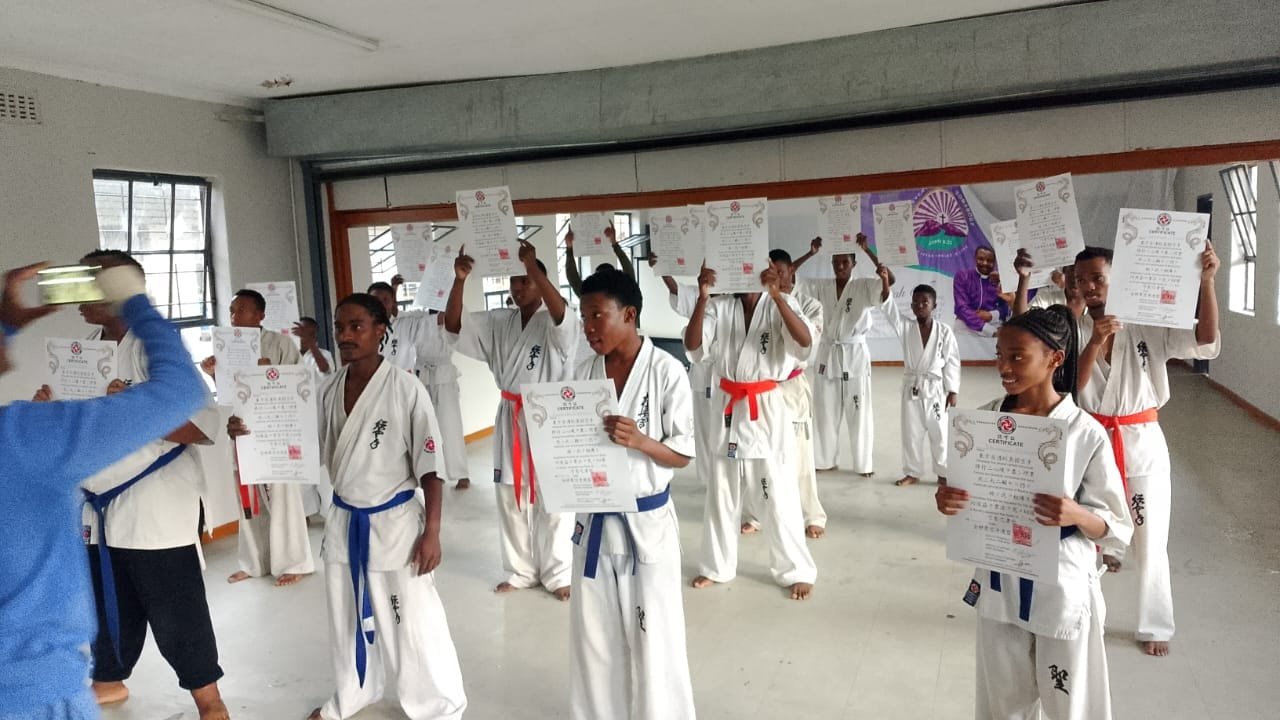 A special highlight of the grading was the promotion of Thabo Winston Nkosi from South Africa, who successfully obtained his 1st Dan Black Belt. His journey with us began in 2018, and after years of perseverance and commitment, he has now reached this important milestone. He graded under the leadership of our Africa Chairman Hanshi Simon Matjiane, with assistance from Senpai Andrew Nkosi.